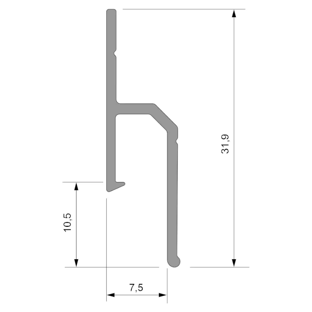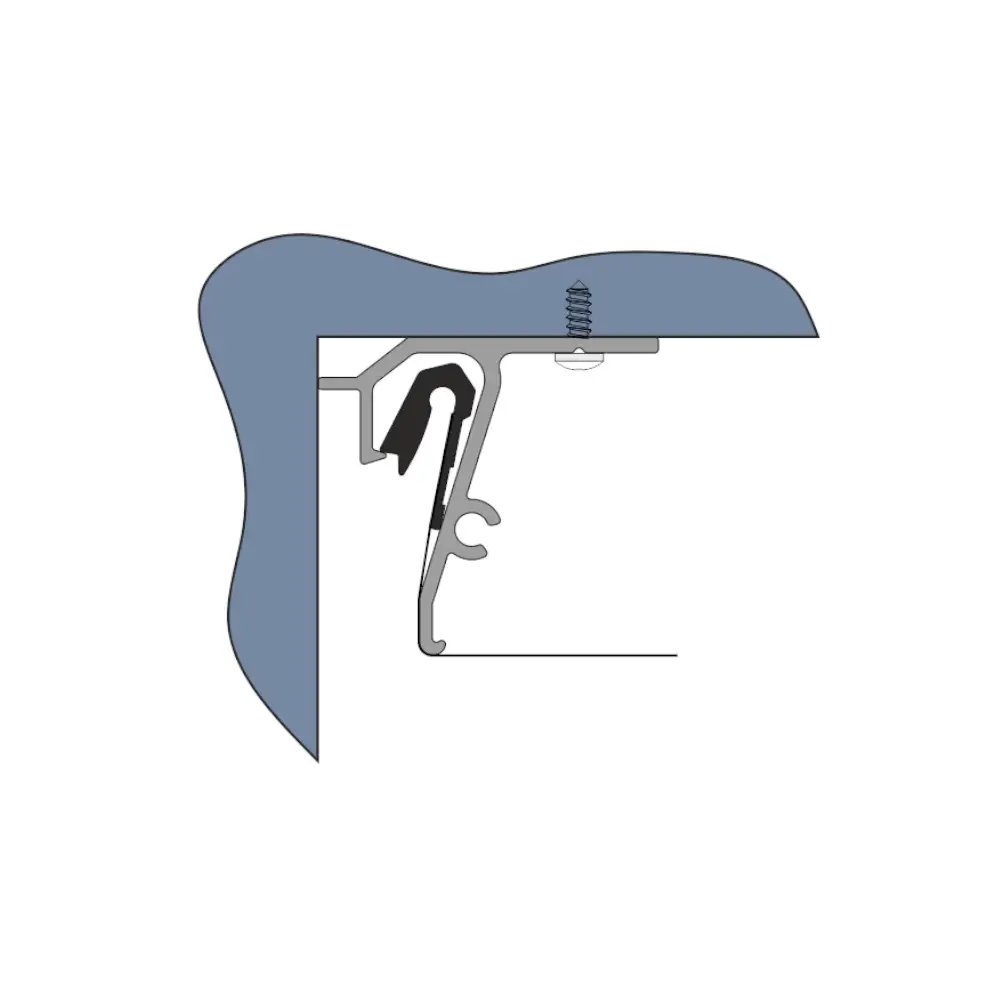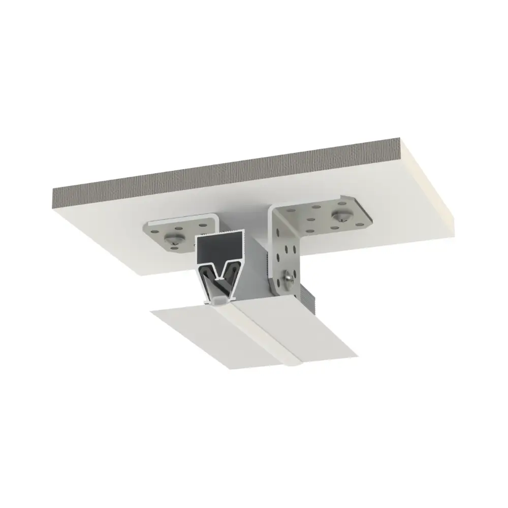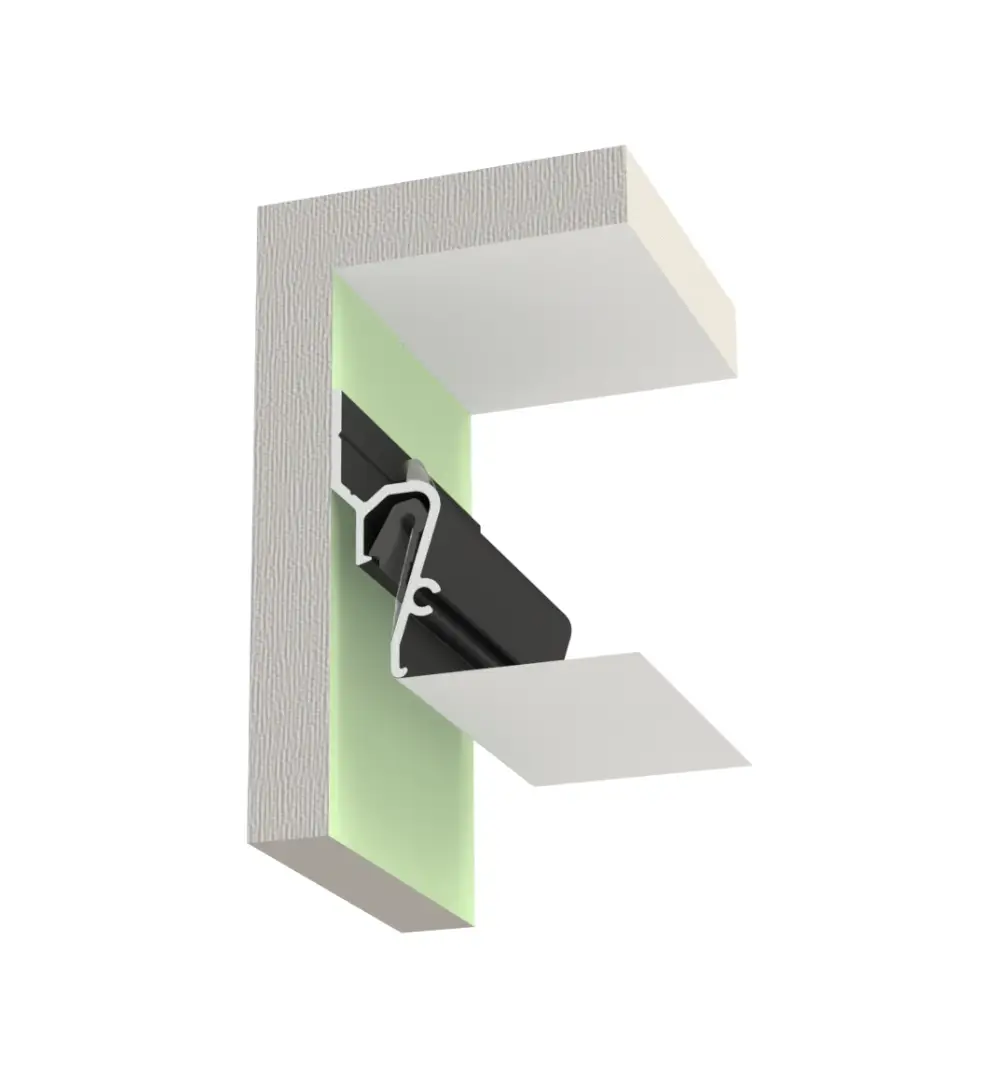 Základní typ hliníkového (ALU) profilu se stropním úchytem pro napínané stropy bez koncovky, který vytváří mezeru mezi stropem a stěnou. Tento profil představuje cenově dostupnější variantu stínového řešení a je vhodný pro projekty, kde je kladen důraz na rovnou zeď a zamítnutí bílé koncovky. Díky stropního kotvení tím vytváří snížení pouze 2 cm od nejnižšího bodu původního stropu.