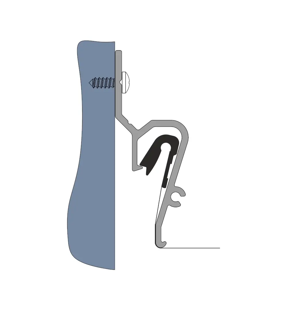 Základní typ hliníkového (ALU) profilu pro napínané stropy, který se montuje na stěnu s minimálním snížením cca 4 cm od nejnižšího bodu stropu. Tento profil je ideální pro standardní instalace. Je závislý na rovinnosti stěn. Profil se dodává s krycí koncovkou (bílou nebo v jiném odstínu), která esteticky zakrývá spoj harpuny s profilem.